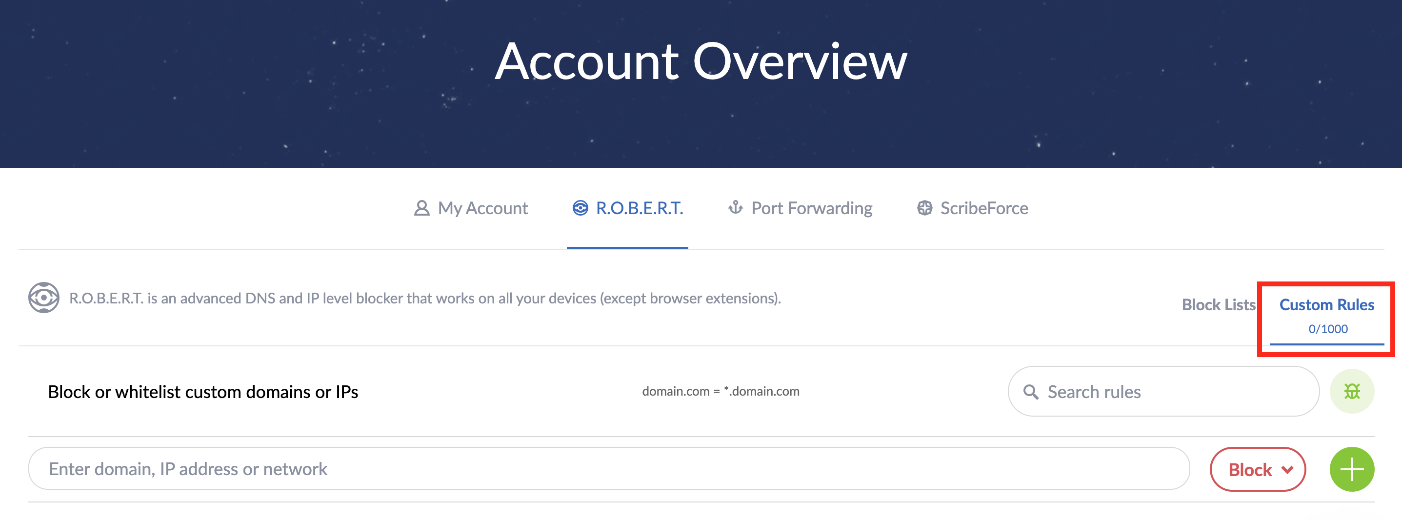 Enter the domain, IP address, or network you'd like to whitelist, block, or spoof, select that action (we've selected spoof in the below image) and then click + icon to add the rule: