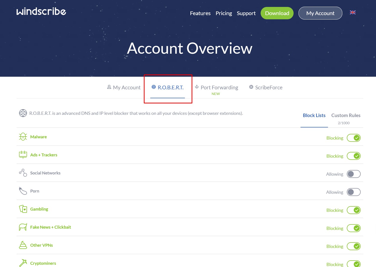 From this page, you can control which of our curated blocklists you'd like to have active by toggling the switch to the right: